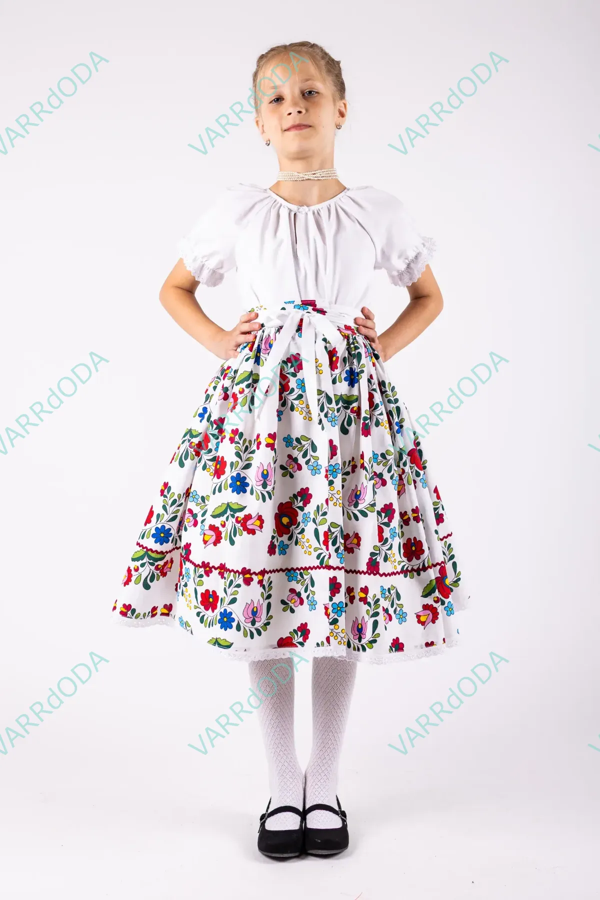 Hagyományőrző fehér matyó néptáncos szoknya gyerekeknek, amely tökéletes néptánc próbákhoz és fellépésekhez. Kényelmes, rugalmas derekú, 100%-os pamutvászonból készült.