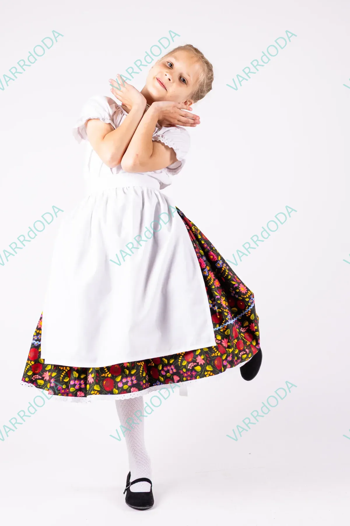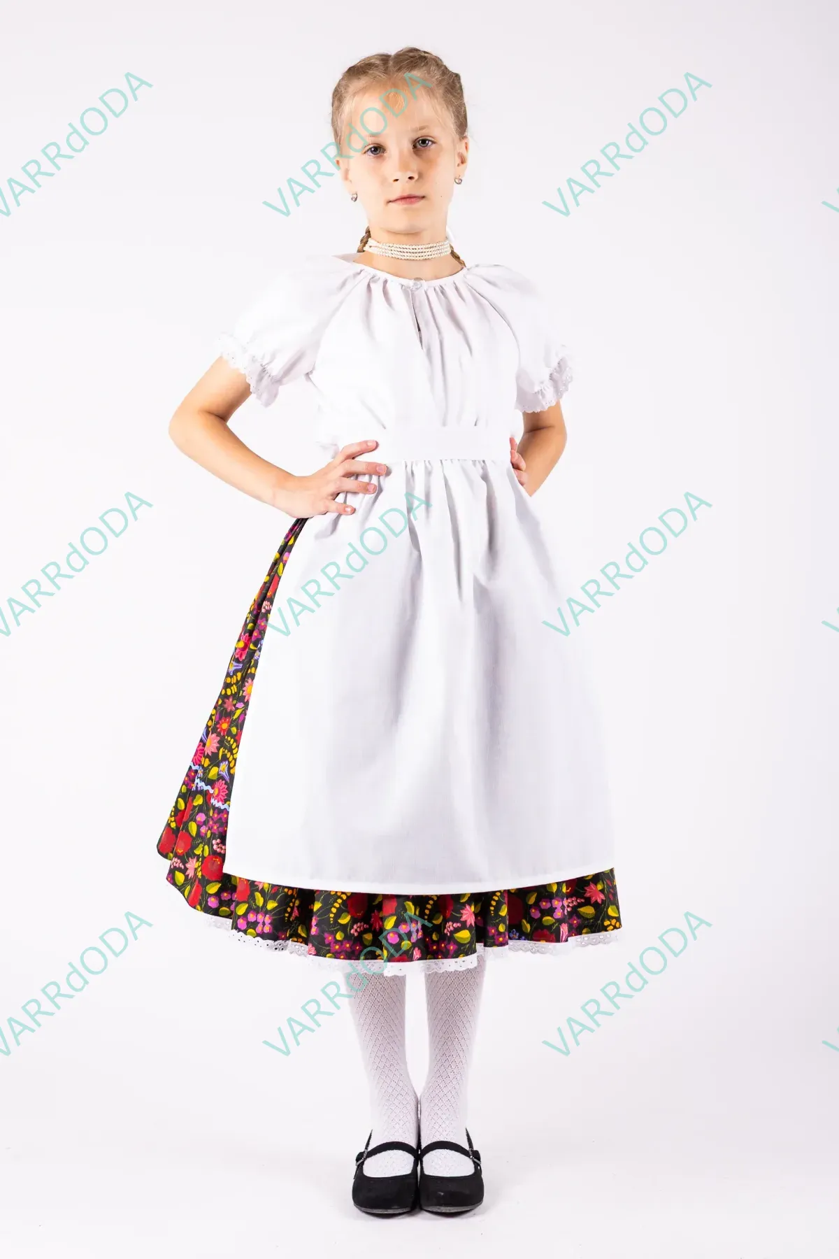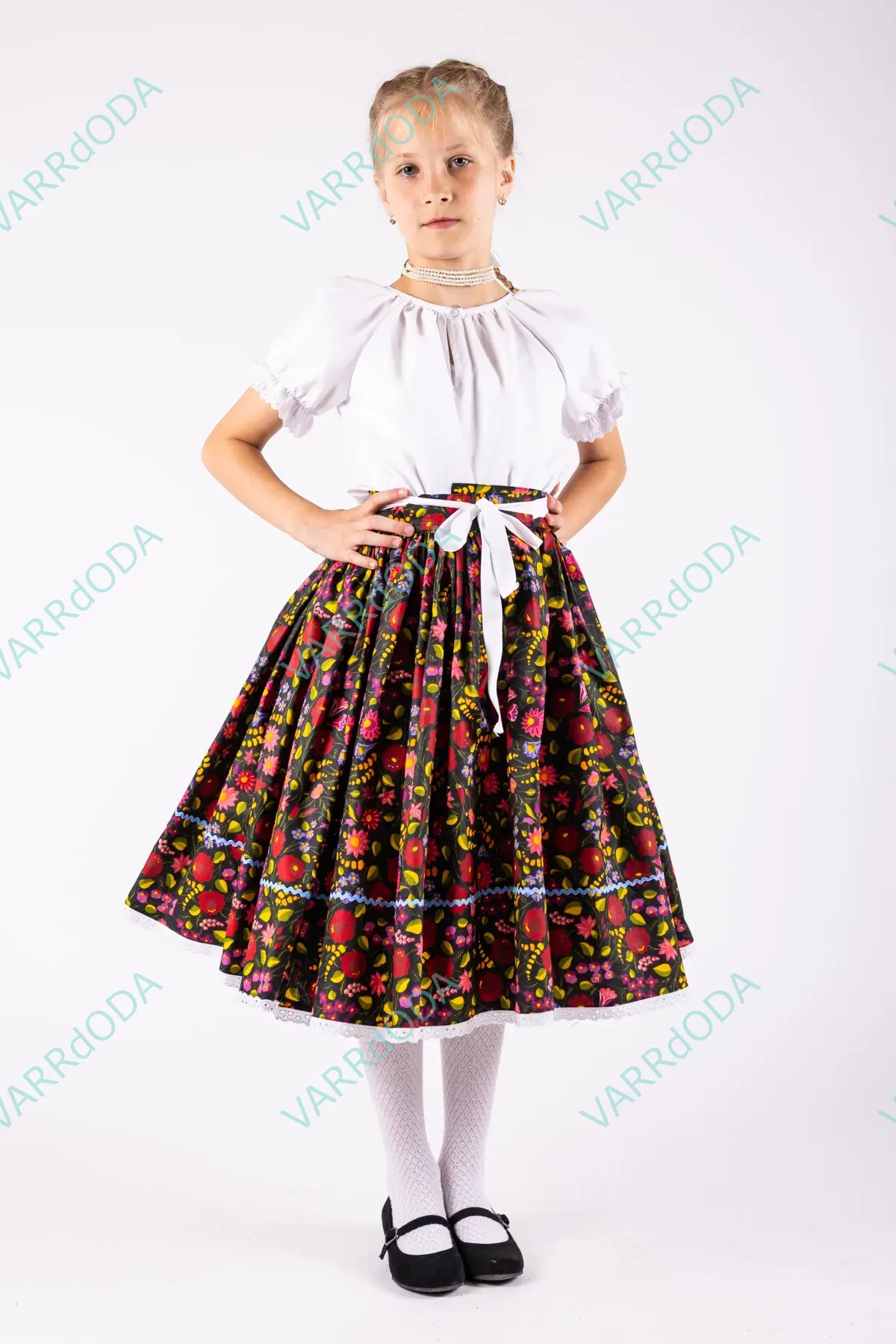 Hagyományőrző fehér matyó néptáncos szoknya gyerekeknek, amely tökéletes néptánc próbákhoz és fellépésekhez. Kényelmes, rugalmas derekú, 100%-os pamutvászonból készült.