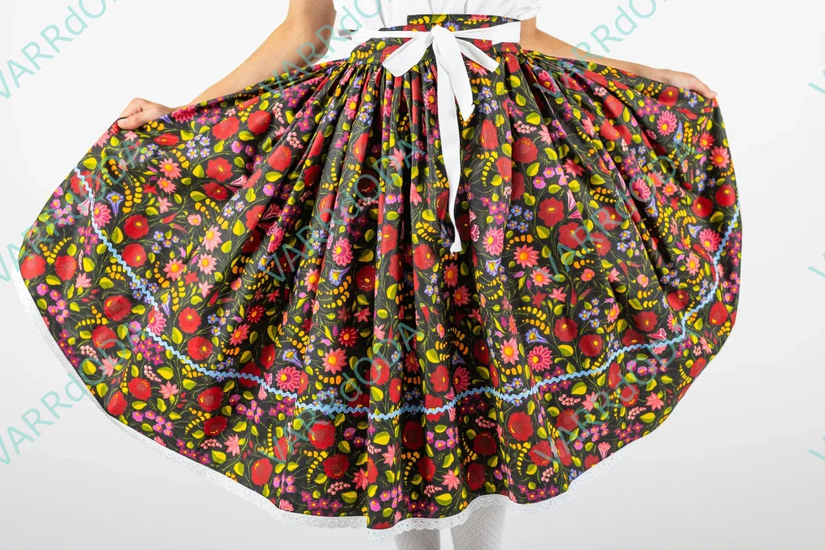 Különböző színű és mintázatú szoknyáink csipke és farkasfog díszítéssel készülnek. A szoknya háromnegyedénél 1vagy két sor farkasfog, majd az alját csipke díszíti. Dereka hagyományos pertlis megkötővel készül és az eleje alja egybevarrott. Egységára gyerekeknek 60 cm korc nélküli hosszig, 3 m anyagbőséggel. Felnőtteknek 61-80 cm korc nélküli hosszig egyégárnak számít, kb. 4,8 m anyagbőséggel. 80 cm korc nélküli hossztól felárat számolunk fel.
