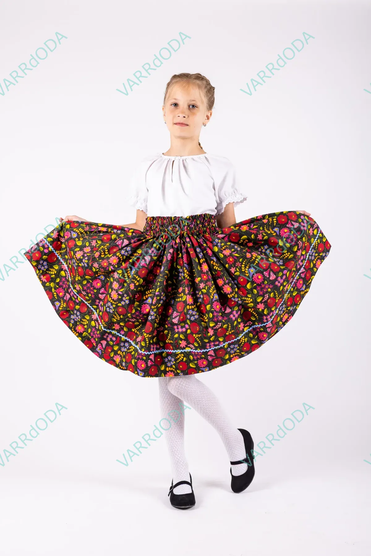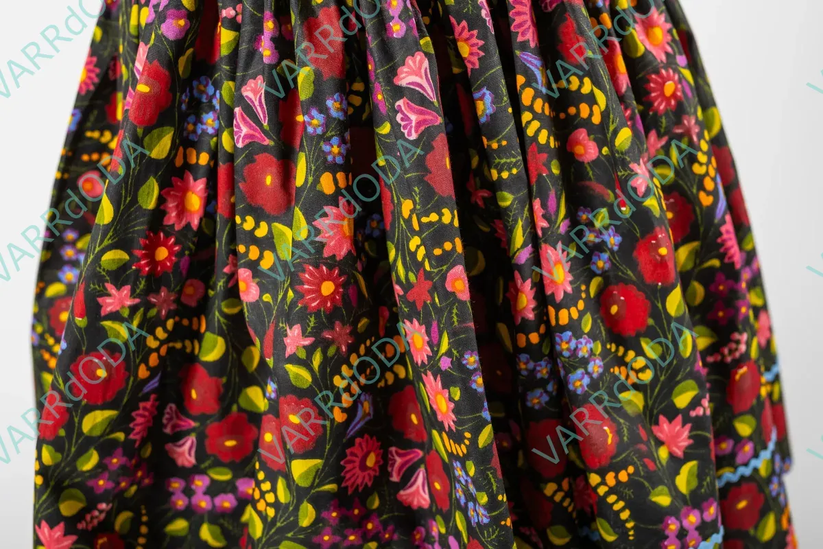A népi hagyományok őrzése nagyon fontos. Ezek a szoknyák segítenek a gyerekeknek minél jobban ráhangolódni a régi idők táncára a próbákon vagy akár a fellépéseken is. Anyaga100 % pamutvászon. A termék saját méretre kérhető a derékbőség és a szoknyahossz megadásával. A szoknya 280 cm anyagbőséget tartalmaz, mely szép fodrozódást és jó pörgősséget biztosít. Az alját farkasfog díszíti és plusz 9 cm anyagráhagyást tartalmaz az estleges szoknyahosszabbítás miatt. Rugalmas derekát két vékonyabb gumi biztosítja, melyek gumiházba vannak behúzva. Ha már szorít a dereka, akkor a régi gumi eltávolítása után, könnyed mozdulattal új gumit lehet bele húzni és rögzíteni a megfelelő méretben. Használat előtt avasd be hideg ecetes vízbe áztatva a hosszú színtartósság érdekében. A fent látható ár maximum 60 cm-es szoknyahossz elkészítésére vonatkozik.