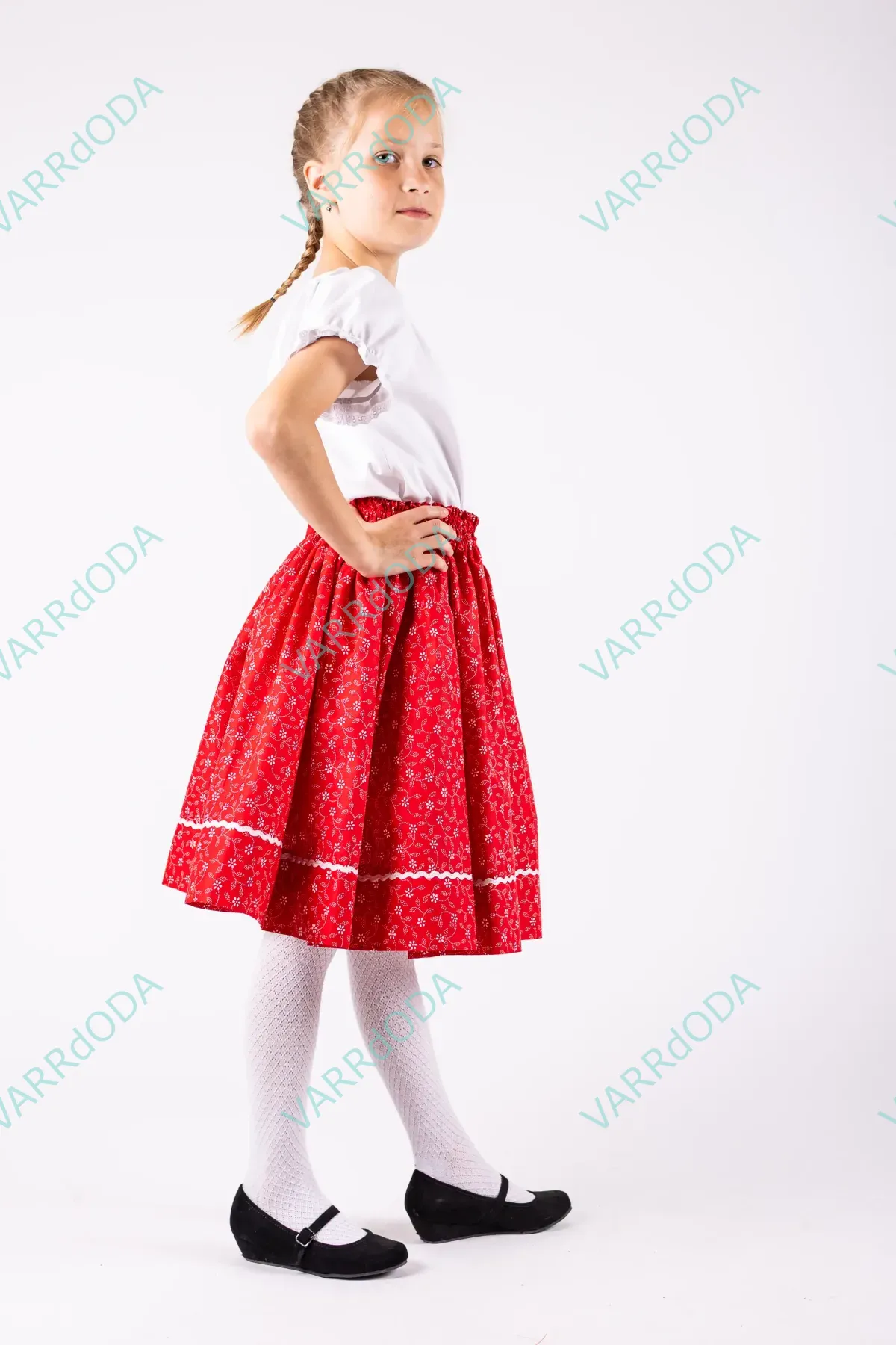 Hagyományőrző indás piros pörgős lányka szoknya gyerekeknek, amely tökéletes néptánc próbákhoz és fellépésekhez. Kényelmes, rugalmas derekú, 100%-os pamutvászonból készült.