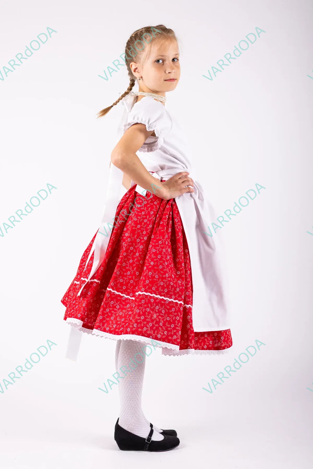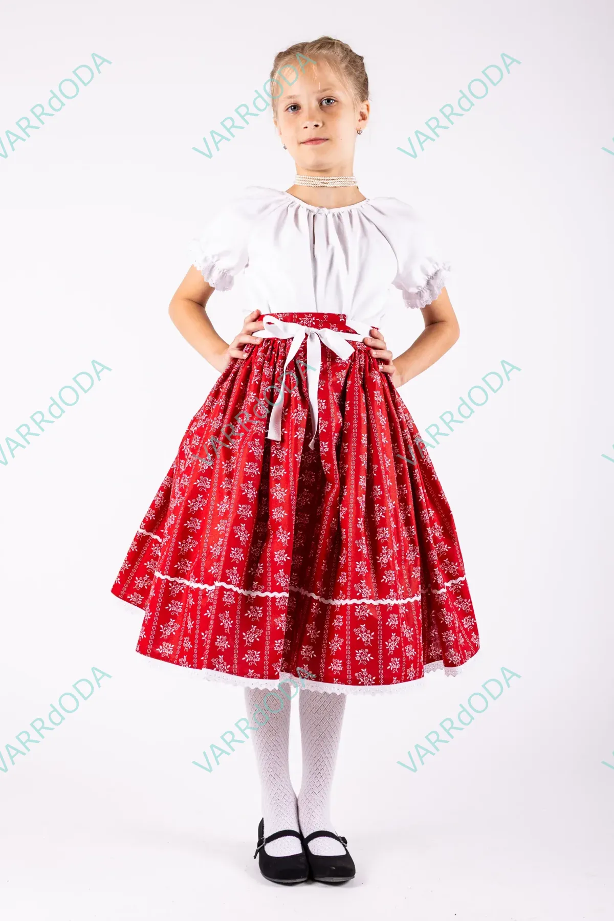 Hagyományőrző piros virágos néptáncos szoknya gyerekeknek, amely tökéletes néptánc próbákhoz és fellépésekhez. Kényelmes, rugalmas derekú, 100%-os pamutvászonból készült.