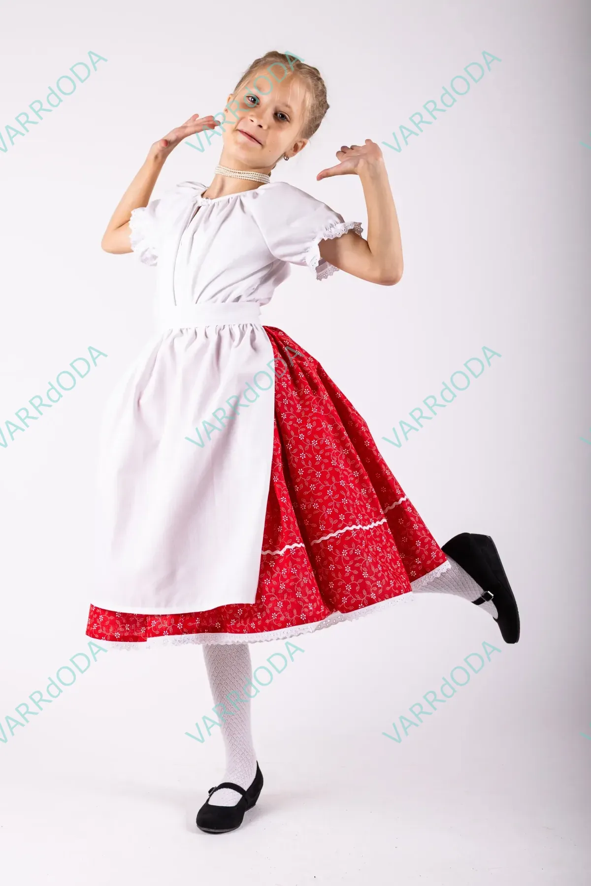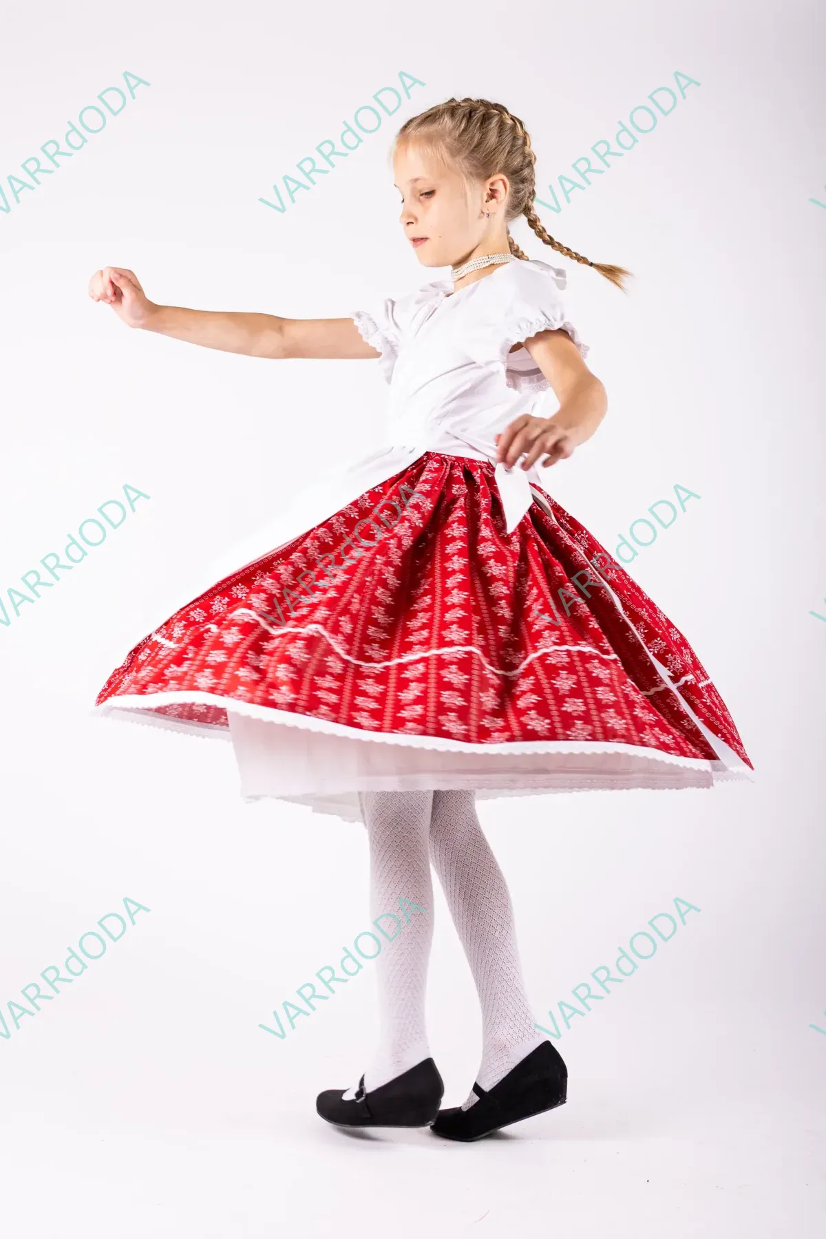 Hagyományőrző fehér matyó néptáncos szoknya gyerekeknek, amely tökéletes néptánc próbákhoz és fellépésekhez. Kényelmes, rugalmas derekú, 100%-os pamutvászonból készült.
