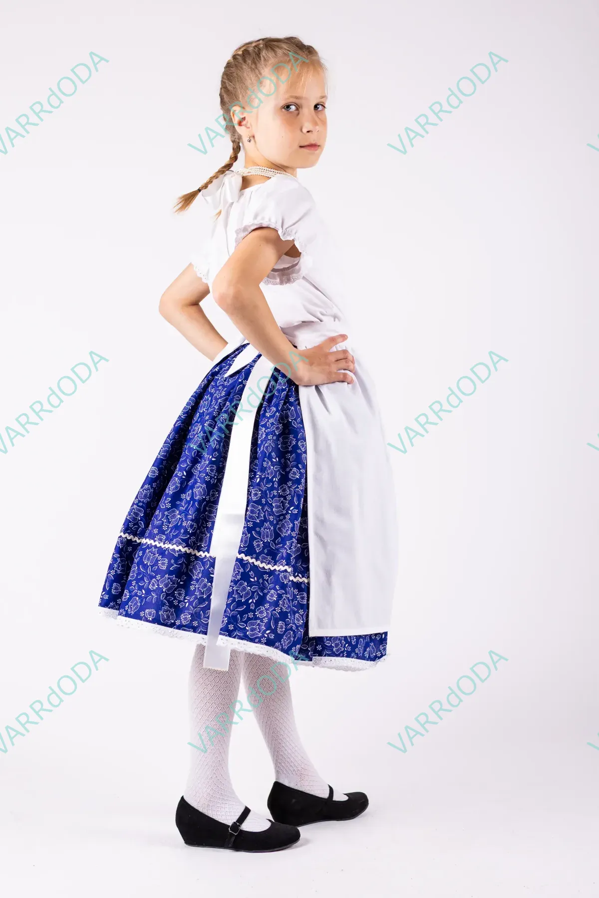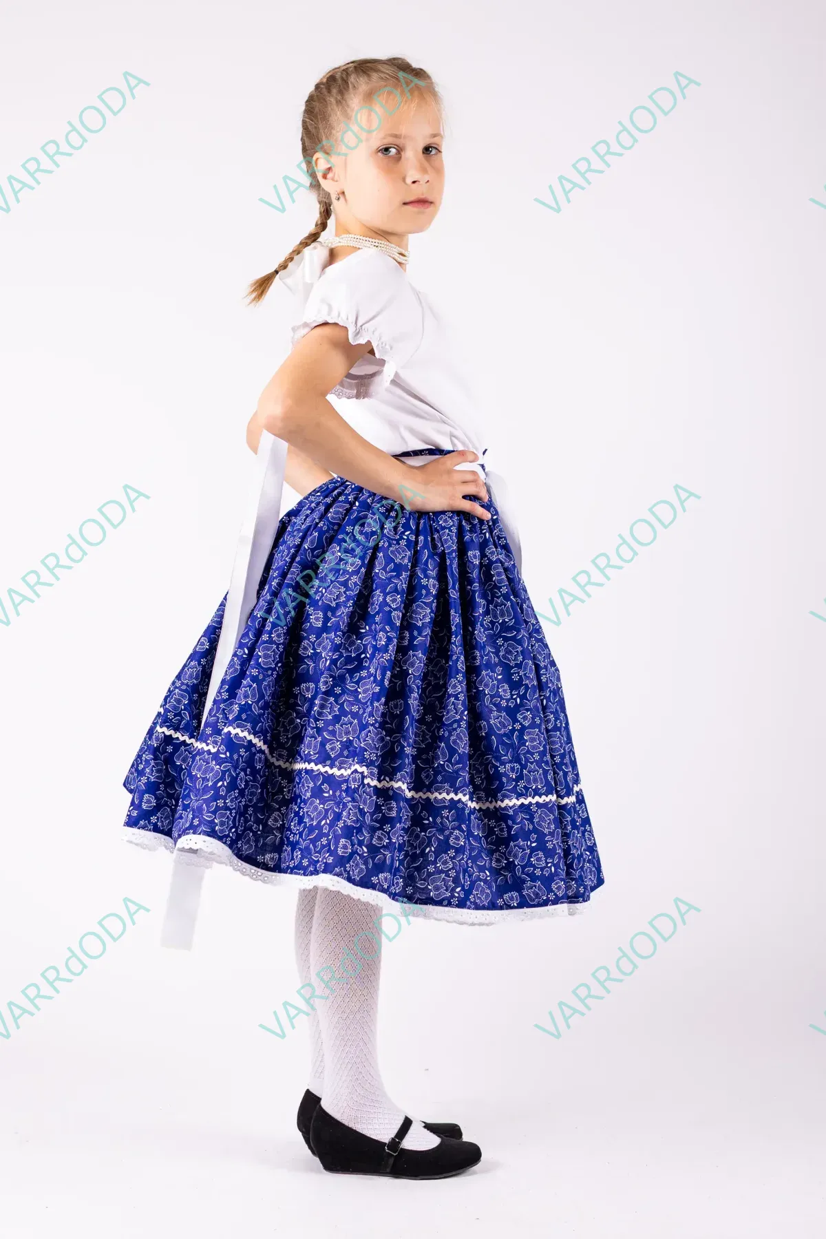 Hagyományőrző kék margarétás néptáncos szoknya gyerekeknek, amely tökéletes néptánc próbákhoz és fellépésekhez. Kényelmes, rugalmas derekú, 100%-os pamutvászonból készült.