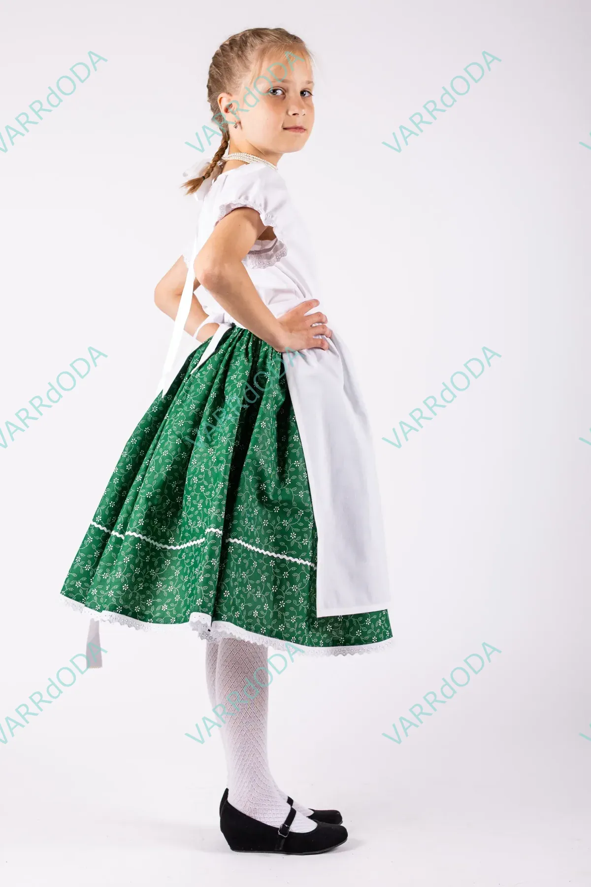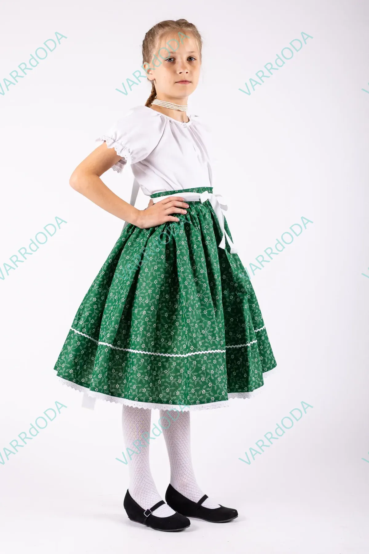 Hagyományőrző zöld indás néptáncos szoknya gyerekeknek, amely tökéletes néptánc próbákhoz és fellépésekhez. Kényelmes, rugalmas derekú, 100%-os pamutvászonból készült.