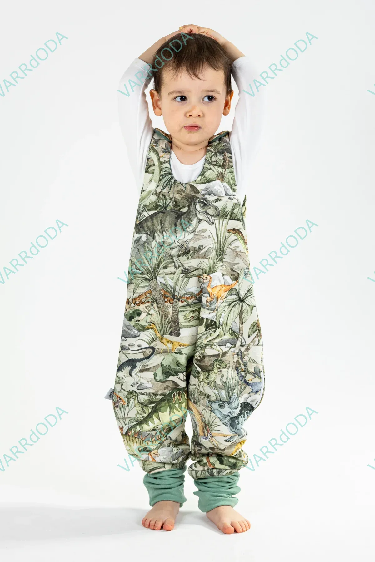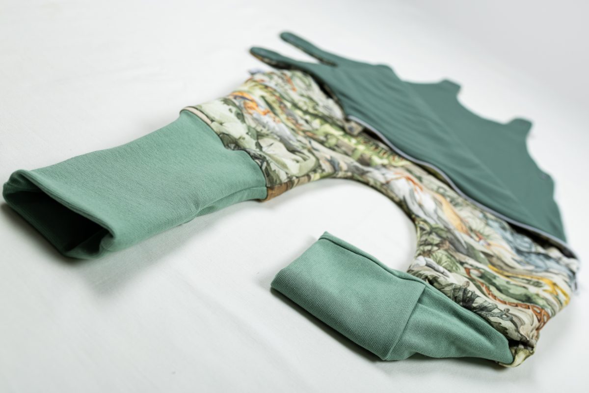 Praktikus dínós ruhatartó zsák gyerekeknek, amely védi a ruhákat, könnyen tárolható, és tetszetős digitális nyomtatással készül 100% pamutból.